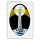 Een illustratie van Bishop Rock lighthouse. This lighthouse is on the Isles of Scilly of the Cornish Coast. The lighthouse is drawn at night, with a stormy sea and full moon.