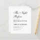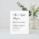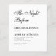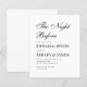 Een eenvoudige, minimalistische zwart-wit repetitie diner uitnodiging. Het heeft alleen zwarte tekst op een witte achtergrond. De titel "The Night Before" is geschreven in een elegant kalligrafisch schrift. De tekst is links uitgelijnd.