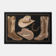 Decoreer met westerne rodeostijl met deze deurmat. Het ontwerp is voorzien van bruine en geelbruine cowboylaarzen en een western pet met hoefijzers op een zwarte achtergrond. Dit ontwerp is originele kunst door Phyllis Dobbs en is beschikbaar met andere kleurenachtergronden en bij het coördineren van producten in een western thema.