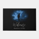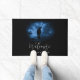 Welkom doormat met een afbeelding van een zwarte roven 's nachts op een boomvertakking met runes waarboven "zwarte roven" staat. Moody en mysterieus.