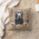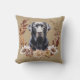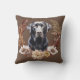 Een prachtig portret van een zwarte Labrador Retriever-hond wordt in het midden van een herfstkrans geplaatst in tinten van kaneelbruin, bruin en crème. Het ontwerp van de hond en krans wordt op een lichtere bruine achtergrond geplaatst. Beide zijden van het kussen hebben hetzelfde afbeelding, maar de achterzijde heeft een donkerbruine achtergrond.