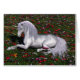 Een mooie eenhoorn ligt vast in een veld van bloemen en vlinders voor rust.