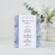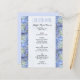 Betaalbare bruiloft of vrijgezellenfeest luncheon menukaart sjabloon met bleke blauwe hydrangea-bloemrand. Kleiner papier van 4 x 5 inch is betaalbaar en . Pas eenvoudig de titel in rand blauw aan, en de resterende zwarte tekst met alle menupunten.