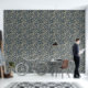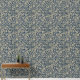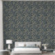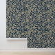 Het is een grafisch bicolor gestileerd waterverf bloemmotief van faux goudbloemen en bladeren op een diep donkerblauwe achtergrond.