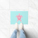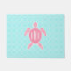 Een doormat met een afbeelding van een roze zee schildpad boven een heldere blauwe quatrefolie-achtergrond. Pas het monogram aan.