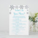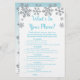 Deze elegante Wat zit er in je telefoonkaarten, is een geweldige manier om het plezier op je Baby shower af te zetten en gegarandeerd een grote hit te zijn! Ga hen eenvoudig rond tijdens het Baby shower waar de gasten het reizen door hun celtelefoons en het controleren van punten zullen leuk hebben die zij van de lijst hebben. De persoon met de meeste punten wint! Dit ontwerp heeft prachtige faux zilveren glitter-draperende sneeuwvlokken met blauwe accenten, perfect voor een winterse baby shower voor een jongen.
