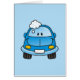 Het glimlachen van een blauwe cartoon auto met zeepbellen.