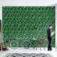 Een achtergrondpatroon van pauwenveren in diepe tinten groen en blauw.