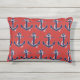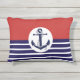 Dit nautische themaontwerp is perfect voor binnen- of buitengebruik. De voorkant van dit accentkussen heeft scherpe, heldere marineblauwe en witte strepen, aan de onderkant en effen rood, aan de bovenkant. Het midden van het ontwerp heeft een witte cirkel, met een marineblauw anker. Op de achterkant van het kussen is het ontwerp een herhalend patroon van het anker over een rode achtergrond.