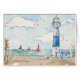 Illustreerde kustplaats met blauwe en witte vuurtoren.