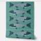 Een blauwgetinte forel of zalm in volkskunststijl op een lichtblauw-groene achtergrond. U kunt de achtergrondkleur wijzigen.