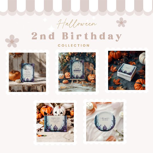 Een spookachtig schattig ontwerp voor de grote dag van je kleintje! Deze gothic-geïnspireerde 2e verjaardagsuitnodiging beschikt over griezelige pompoenen, bloemen en spookachtige charme in tinten blauw en paarse. Perfect voor een Halloween-thema peuter viering. Volledig bewerkbaar voor de details van uw evenement.