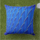Dit kussen heeft een blauwe omheining erop afgebeeld.