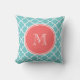 Blauwgroen Quatrefoliepatroon, koraalmonogram Kussen