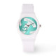 Dit sportieve volleybalhorloge voor meisjes heeft een turkoois / blauwgroen en wit volleybalbeeld met een kunstzinnig bloemenkaleidoscopisch patroon gemengd met de niet-witte volleybalpanelen - haar naam en jerseynummer zijn aanpasbaar - door katz_d_zynes