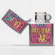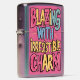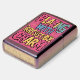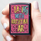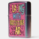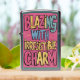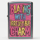 Een digitale illustratie van de zin Blazing With Irresistible Charm weergegeven in kleurrijke, cartoon-stijl belettering. De achtergrond is een effen roze.