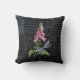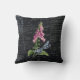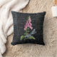 Stijlvol kussen met gooi met een collage van botanische stijl illustraties van roze bloemen en een blauwe libel op een benauwde zwarte efemera achtergrond