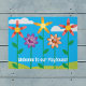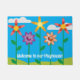 Grote kleurrijke bloemen tegen een heldere blauwe lucht in een leuke kinderillustratiestijl voor kinderspeelhuisje.