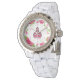 Een horloge voor leraren met de logo van The Pink Schoolhouse in het midden met roze bloemrand. Personaliseer met jouw naam onder schoolgebouw. De cijfers zijn roze en groen.