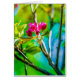 Sluit uitzicht van een cluster van rode krabappelbloemen in een boom af tegen een kleurrijke groene, gele, blauwe en roze achtergrond. Textured photography. Crab apple tree is een symbool van jeugd, vreugde en goede magie. Wenskaarten voor iedereen.