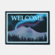 Paarse en blauwe noordelijke lichten gloeien boven met sneeuw bedekte bergen op een koude nacht in het verre noorden. De tekst, "WELCOME"verschijnt ook in gloeiend blauw en wit.