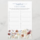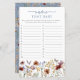 Blue Boho noemt het spel Baby. Daag je gasten uit met deze Name That Baby Game, een leuke en boeiende activiteit voor je baby shower. De voorkant is voorzien van een elegant stoffig blauw script, dat spelers begeleidt om babynamen te matchen met hun beroemde ouders of complete klassieke kinderrijmpjes. De achterkant is versierd met een coördinerend patroon van boho-vlinders, wilde bloemen, gedroogde grassen en zacht saliegroen gebladerte op een stoffige blauwe achtergrond, wat zorgt voor een gepolijste en stijlvolle look. De warme aardse tinten van bruin, bruin, roest, terracotta, verbrand sinaasappel en gedempt saliegroen maken dit spel ideaal voor elk voorjaar, zomer, herfst of winter baby shower. Of gasten nu trivia pro's zijn of gewoon voor de lol, dit prachtig ontworpen spel zal zeker vreugde en vriendelijke concurrentie brengen voor uw feest!