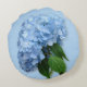 Blauwe florale ronde accuskussen. Lichte blauwe hydrangea-bloem met groene bladeren is het afbeelding aan beide zijden boven een lichtblauwe kleur.