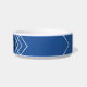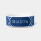 Uniek ontwerp van de kom van een gezelschapsdier in blauw, wit en koninklijk blauw met overlappende geometrische lijnen en vierkanten met de naam van een kat of hond, gedrukt in het midden van de voorkant van een witte keramische voedselbak of waterkom. ONTWERPTIP: alle kleuren en lettertypen zijn bewerkbaar zodat u uw eigen creatieve kom kunt ontwerpen als een kunstwerk dat overeenkomt met uw decor!