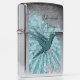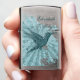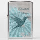 Deze aansteker van Zippo kenmerkt een blauwe kolibrie met een tekst sjabloon om het met jouw naam of initialen aan te passen.