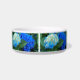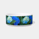 Keramische kom voor voeder voor gezelschapsdieren voor katten of honden met een foto-afbeelding van mooie, blauwe hydrangea-bloemen, die in een repetitief patroon is gedrukt. Een mooi, bloemetjesontwerp! Selecteer de grootte van de kom van uw huisdier.