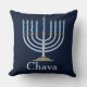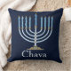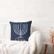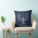 Licht Blauwe Menorah Toss Pillow op een donkere blauwe achtergrond. Eenvoudig aan te passen met jouw naam of bericht. Geweldig Hanukkah cadeau!