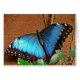 Een close-up kijk naar een gezonde Blauwe Morpho-vlinder met blauwe vleugels tegen de houten kant, bij het Magic Wings Butterfly Conservatory in Massachusetts.