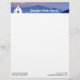 Kerk briefhoofd met het witte silhouet van een kerk tegen blauwe bergen.