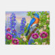 OEuvre d'art originale d'un râleur mâle de l'Est dans un jardin fleuri par l'artiste animalière et designer Carolyn McFann de Two Purring Cats Studio. Idée cadeau pour les amateurs d'oiseaux, d'observation des oiseaux et de nature !