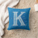 A detailed blueprint-style illustration of the letter K is presented against a vibrant blue background. The letter itself is rendered in white, with intricate details and precise measurements indicated by thin white lines. The back of the pillow includes a blue outline of the letter K set against a textured light beige background with a 4-line poem about the letter below.
