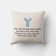 A detailed blueprint-style illustration of the letter Y is presented against a vibrant blue background. The letter itself is rendered in white, with intricate details and precise measurements indicated by thin white lines. The back of the pillow includes a blue outline of the letter Y set against a textured light beige background with a 4-line poem about the letter below.