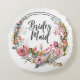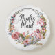 Dit ronde werpkussen heeft een blozende bloemenkrans en "Brides Maid" in elegant schrift op een zachte witte achtergrond. Een prachtig cadeau voor bruidsmeisjes of een mooi accent voor bruidssuites en kant-en-klare kamers. Een deel van het Blush Floral Wedding Collectie.