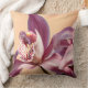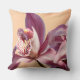 Hoge resolutie close-up van een roze Cymbidium orchidee met gestreepte bloemblaadjes en een rood gespikkelde lip, geplaatst tegen een zachte perzik achtergrond. Elegante botanische fotografie voor prints, kaarten, textiel en moderne huisdecoratie.