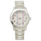 Dit dameshorloge heeft een modern ontwerp uit het midden van de eeuw van zich herhalende rechthoeken in blauwgroen, sinaasappel, biet en sinaasappel op een veld van wit. Als je het ontwerp leuk vindt, maar liever verschillende kleuren hebt, stuur me dan een bericht.