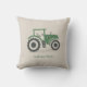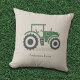 Een licht beige kussen met een afbeelding van een groene en grijze boerderijen tractor in cartoon stijl en aanpasbare tekst hieronder! Het kan een perfect cadeau zijn voor een boer of een plattelandsgezin!