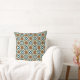 A striking decorative throw pillow featuring a complex, symmetrical geometric repeat pattern. The design is characterized by large starburst or floral motifs in rich terracotta/rust color, interspersed with white "X" shapes set against a background of dark navy blue and seafoam green/teal. The warm, rustic earth tones combined with the contrasting navy and crisp white give this pattern a distinct bohemian, Moroccan tile, or tribal textile aesthetic. Perfect for adding a bold, cozy, and globally inspired element to your home decor.
