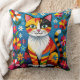 A cute cat themed throw pillow. A cute colorful boho cat sitting in flowers and surrounded by butterflies. The art is in an impasto oil paper quilling style.