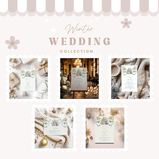 Een dromerige mix van zachtblauwe ornamenten, goudkleurige sterren en bevroren dennentakken komen samen in dit boho-winterbruiloftsontwerp. Een pastelpalet en met de hand geschilderde cadeauaccenten roepen een magische, serene vakantiegeest op - chic, kalm en gezellig.