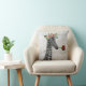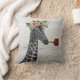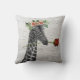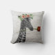 Een kussen met een zwart-wit afbeelding van een giraffe met een bloemkroon. Achtergrond is witte bakstenen. Giraffe houdt een rode roos in zijn mond.