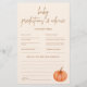 Een heerlijke mix van feestelijke charme en hartverwarmend plezier perfect voor elk herfst baby shower. Dit genderneutrale spel is versierd met chique boho-design en kleurrijke pompoendouches, die naadloos aansluiten op zowel babyboy- als babymeisjesdouches. Met zowel oranje als blauwe pompoenmotieven belichaamt het de herfstgeest en biedt het een creatieve uitlaatklep voor gasten om hun voorspellingen en advies te delen. Ideaal voor diegenen die op zoek zijn naar unieke kleine pompoen of lil pompoen baby shower ideeën, dit spel voegt een gepersonaliseerde touch aan uw viering, waardoor het onvergetelijk voor alle aanwezigen.