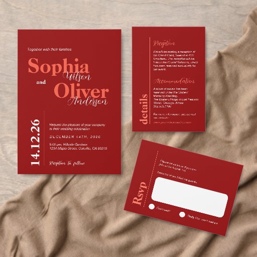 Bold Cherry Red Minimalist Wedding Invitation. Een ideale keuze voor een lichte en stijlvolle bruiloft. Pas dit ontwerp aan met uw persoonlijke informatie en uw initiaal aan de achterkant.
