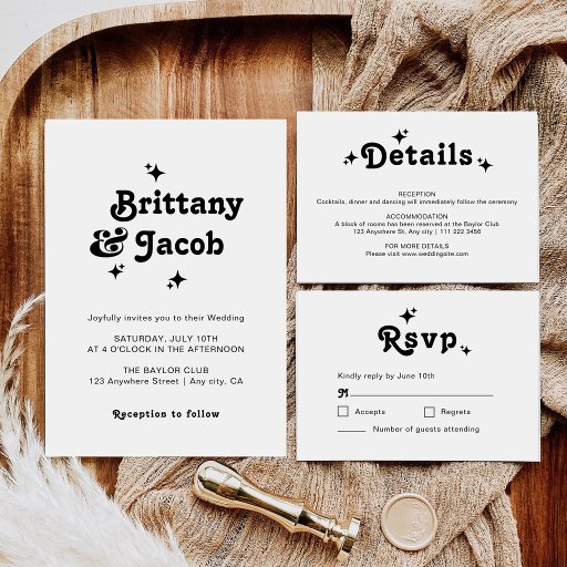 A collection of minimalist bold Retro typography wedding suite.