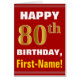 Ce simple design de carte de voeux sur le thème de l'anniversaire présente un voeu d'anniversaire chaleureux comme "HAPPY 80th BIRTHDAY, First-Name!" sur le devant, en texte gras sur un arrière - plan de couleur rouge. Le numéro d'anniversaire a une apparence de coloration fausse/imitation or. Le nom sur le devant peut être customisé. L'intérieur comporte un message d'anniversaire qui peut être customisé. Une carte de voeux comme celle-ci pourrait être une façon amusante d'offrir des voeux d'anniversaire à quelqu'un qui célèbre son quatre-vingtième anniversaire. [~Z0000276]