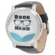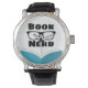 Illustratie van een bril en een boek met tekst: "Book Nerd"