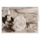 Une carte à l'ancienne avec une bougie et un rose allongé sur satin et dentelle